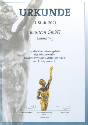 masitcon wurde zum „Großen Preis des Mittelstandes“ 2021 der Oskar-Patzelt-Stiftung nominiert.